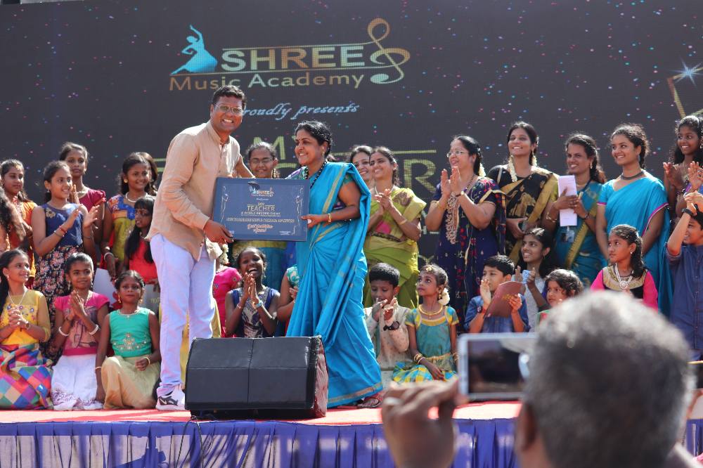 The record for the maximum number of students presenting thanksgiving cards to teachers while dedicating a performance in a day is 1,153 and was set by B.G. Sriram Prabhu, Shree Music Academy, Ambattur, Chennai, at the Rajarathinam Stadium, Egmore, Chennai, on October 6, 2019.
